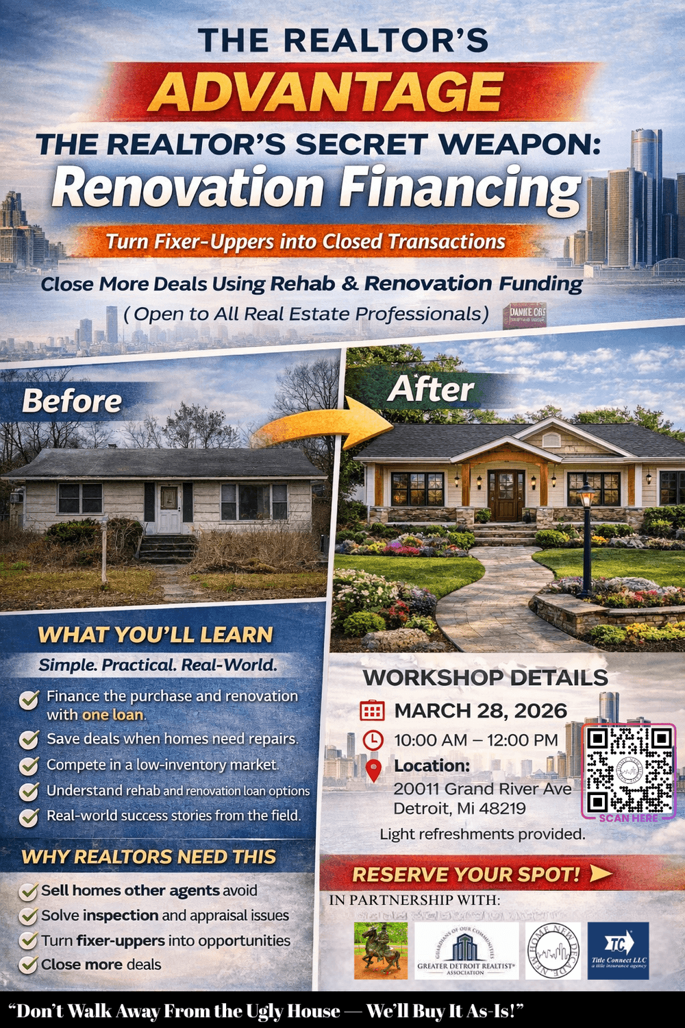 March 28, 2026 (Realtors 201 - 2 - 3-hour event) at Our Gathering Place in Detroit, MI (Title Connect) is our partner on this one.