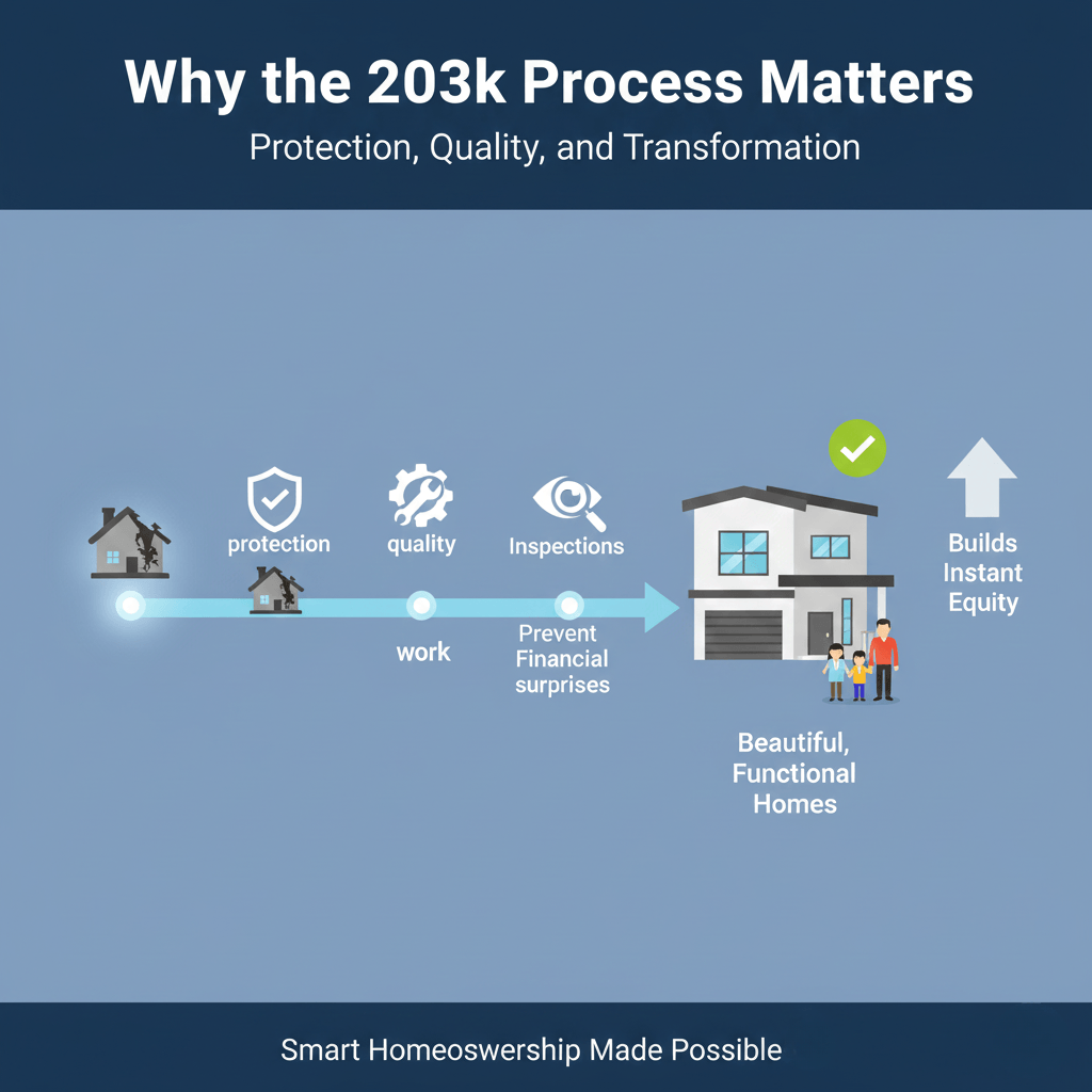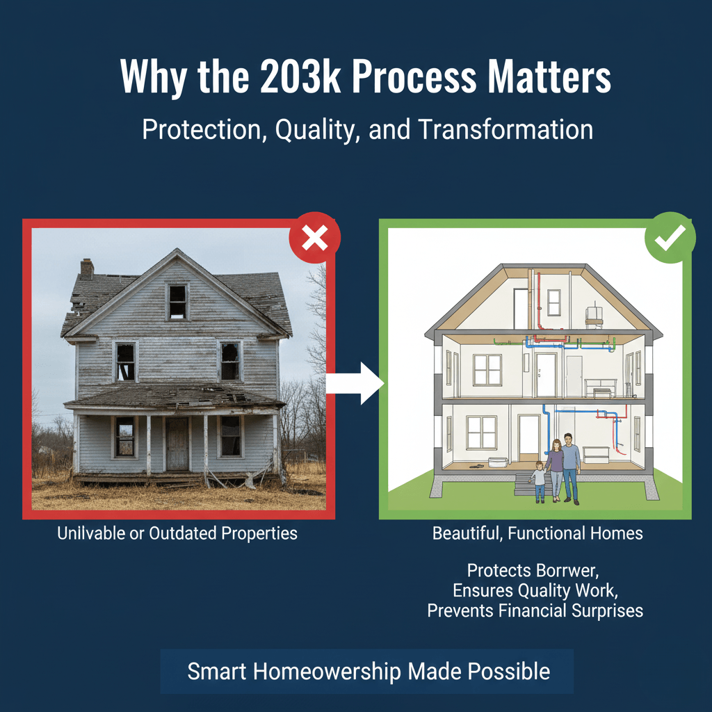 The 203k process is structured to protect everyone involved—especially the borrower. With checks and balances, inspections, and guidelines, the system is designed to ensure quality work and prevent financial surprises.